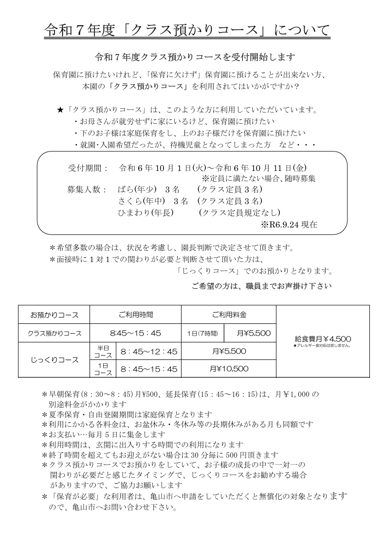 この度、令和7年度「クラス預かりコース」の募集をします。
