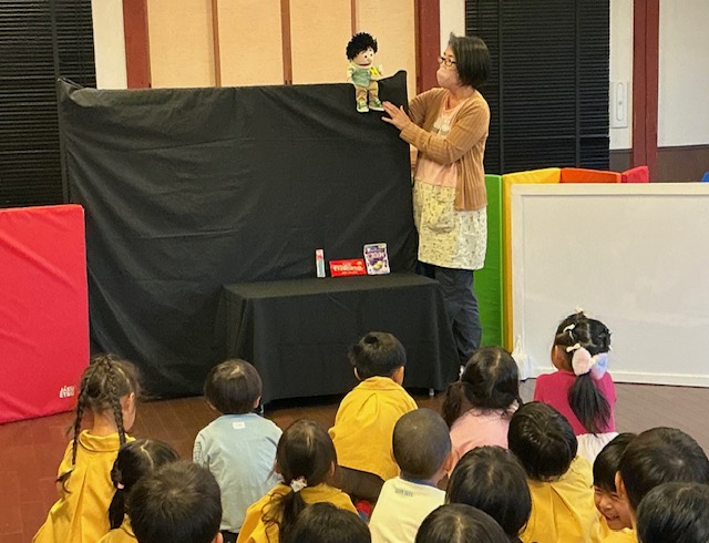 園児たちは同じ演目を見ていても飽きないようで、「朝ごはんはメロンパン」というけんちゃんにダメ出しする子どもたちです。